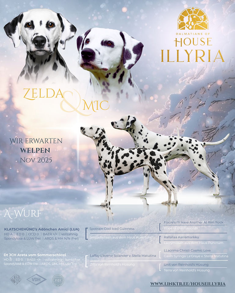 Mic trägt der wertvolle LUA-Gen (N/hu, mischerbeig) und ist reinerbig schwarz-weiß, dadurch erwarten wir in dieser Verpaarung LUA als aus HUA Dalmatiner Welpen in klassisch schwarz-weißer Zeichnung.